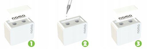 - Wlej po kilka kropel tuszu NOMO-INK do obydwu otworów (użycie innego tuszu grozi zniszczeniem pieczątki)