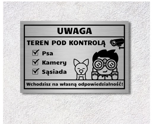 Odporna na deszcz, słońce i śnieg zabawna tabliczka informująca o zwierzętach i monitoringu na posesji