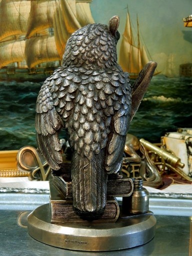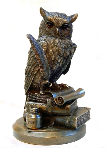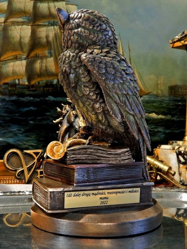 Zapraszam do zakupu wspaniałej figurki sowy na książkach. Stary, znany już w starożytnym Egipcie i Grecji symbol mądrości i wiedzy. Doskonała rzecz na prezent dla nauczycielki, wykładowcy, profesora . Przedmiot wykonany z materiału typu poliresin, to mieszanina żywicy i kamienia.