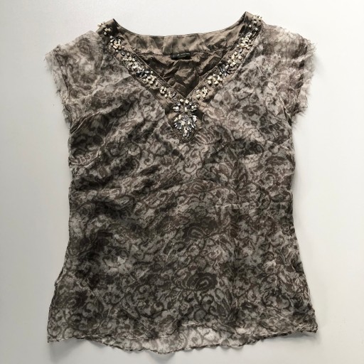 Bluzka posiada zamek z boku dekolt ozdobiony naszywanymi kryształami , kamieniami i perełkami rękawy strzepione