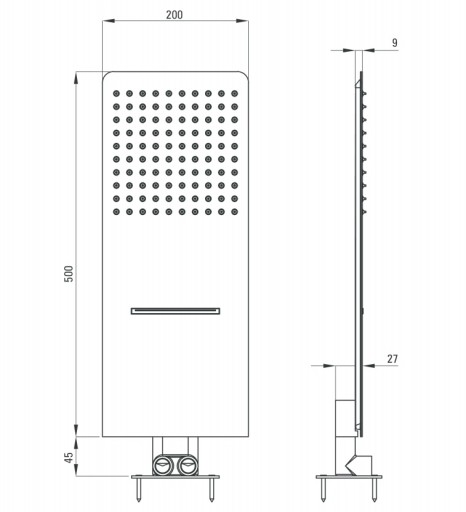 Głowica prysznicowa to wygodne rozwiązanie dla każdej łazienki. Deszczownica daje stały, napowietrzony strumień wody, redukując jej zużycie. Zapobiega chlapaniu na boki, co znacznie ułatwia sprzątanie kabiny prysznicowej. Jest dużo bardziej dyskretna niż tradycyjna słuchawka, co jest istotne zwłaszcza w małych łazienkach. Łatwa w montażu, ma standardowe przyłącze. Produkt wyjątkowo cienki i estetyczny — ultra slim. Głowica ma kształt prostokąta o wymiarach 500x200 mm.