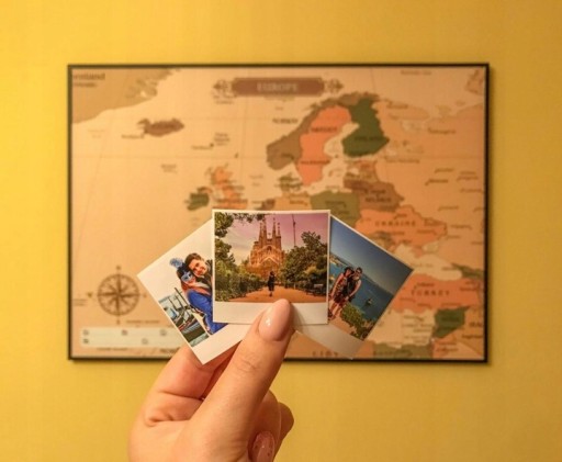 Zaznaczaj na mapie swoje zdjęcia obok miejsc w których zostały zrobione. Razem z mapą otrzymasz 20 zdjęć wydrukowanych w formacie 5×5 cm które od razu będziesz mógł przypiąć do mapy. Jeśli z czasem dojdą nowe miejsca w każdej chwili możesz zamówić u nas dodatkowy pakiet zdjęć, lub wydrukować we własnym zakresie!