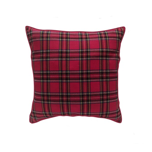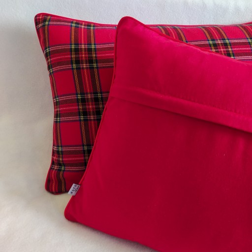 Świąteczna poszewka w kratę wykończona ozdobną czerwoną wypustką.