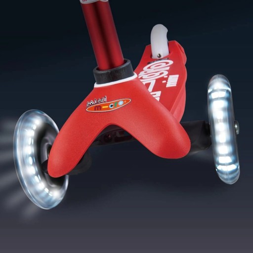 Hulajnoga Mini Micro Deluxe w wersji LED posiada świecące przednie kółka. Zatopione w kołach diody LED podczas jazdy na hulajnodze świecą tworząc niezwykły efekt, który czyni hulajnogę jeszcze bardziej atrakcyjną. Efekt ten nie tylko dostarcza dodatkowej zabawy, ale także sprawia, że dziecko jest bardziej widoczne podczas jazdy na hulajnodze, co przekłada się na większe bezpieczeństwo. Dzięki wykorzystaniu indukcji nie ma potrzeby przejmować się baterią, gdyż diody pozyskują energię z kręcących się kółek.