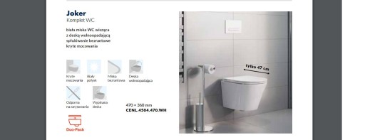 Miska WC Joker z deską wolnoopadającą to świetny wybór dla osób ceniących klasyczny, ponadczasowy styl wnętrz. Subtelny kształt miski wpasowuje się również doskonale w nowoczesne aranżacje. Bezrantowa miska z wysokiej jakości ceramiki w połączeniu z optymalnym kształtem i ukrytymi mocowaniami ułatwiają utrzymanie najwyższego standardu higieny.