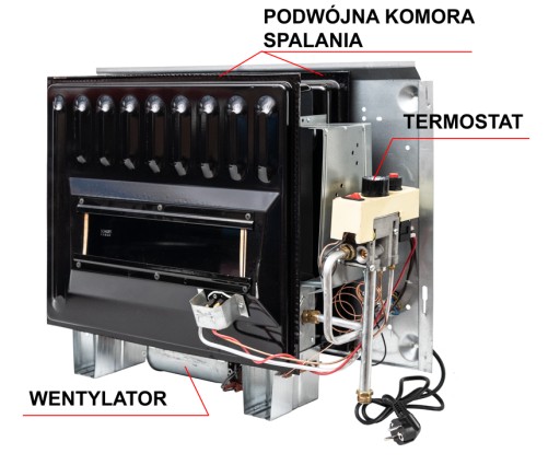 - Komora spalania jest pokryta emalią, co oznacza odporność na temperaturę i dużą żywotność.
