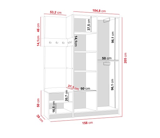 - Garderoba wykonana z laminowanej płyty wiórowej o gr. 16 mm.
