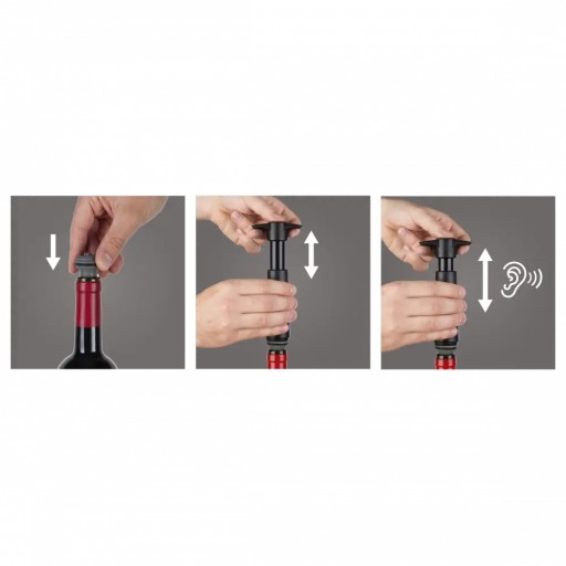 Wyciągnij powietrze z otwartej butelki wina za pomocą pompki próżniowej Vacu Vin i zamknij ją ponownie gumowym korkiem wielokrotnego użytku. Wystarczy włożyć uniwersalny korek do wina do szyjki butelki i pompować, aż usłyszysz opatentowany dźwięk „kliknięcia”. Jest to sygnał, że osiągnąłeś optymalny poziom próżni i hermetyczne uszczelnienie.