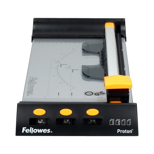 * trymery przeznaczone do okazyjnego użytku w małym biurze do cięcia dokumentów o rozmiarze do A4 (Proton A4) lub A3 (Proton A3) * zawierają bezpieczną w użyciu unikalną kasetę Fellowes SafeCut™ z ostrzem ze stali nierdzewnej, ostrze pozostaje cały czas w osłonie kasety, jest wysuwane tylko w momencie cięcia * w zestawie kaseta z ostrzem do cięcia prostego, możliwość dokupienia dodatkowych ostrzy do cięcia falowanego, perforacji oraz zaginania * zintegrowany system przechowywania kaset SafeCut™ gwarantuje, że ostrza zawsze będą pod ręką * tną jednorazowo do 10 arkuszy papieru (80 g/m2) * metalowa baza zintegrowana z antypoślizgowymi nóżkami * docisk papieru z możliwością ustawienia pozycji zapobiega przesuwaniu się dokumentu podczas cięcia * miarki cięcia dla różnych rozmiarów dokumentów, zdjęć i do cięcia pod kątem * bezpieczna pozycja karetki w czasie spoczynku ułatwia wymianę kasety z ostrzem oraz przenoszenie * przyjazna dla użytkownika, ergonomiczna konstrukcja * specjalne wgłębienia w podstawie ułatwiające przenoszenie