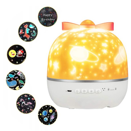 -Dynamiczna projekcja 6 kolorów: z przodu lampki nocnej znajdują się 4 przyciski. Przycisk 1: włącz/wyłącz. Przycisk 2: poziom jasności, 3 regulowane poziomy jasności, dzięki czemu jasność czytania jest najwyższa, a sen najniższy. Przycisk 3: Zmiana koloru: niebieski, żółty, biały, ciągły, powoli zanika i miesza się, w razie potrzeby możesz wybierać między pojedynczym kolorem a mieszanym kolorem. Przycisk 4: sterowanie rotacją.