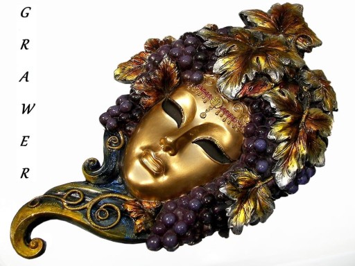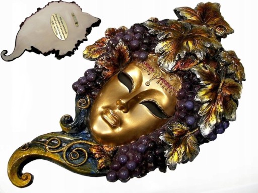 Zapraszam do zakupu wspaniałej maski weneckiej.Bajeczna maska to twarz pięknej kobiety okolona winogronami. Maska pyszni się bogactwem kolorów, robi niezwykle wytworne wrażenie.Całość fantastycznie się prezentuje , maska bardzo realistyczna, ręcznie malowana.Przedmiot wykonany z materiału typu poliresin, to mieszanina żywicy i kamienia .Kolekcja VERONESE , markowy produkt najwyższej klasy.Zwróć uwagę na niezwykle precyzyjne wykonanie Przedmiot znacznie lepiej wygląda w naturze .To może być niezwykle wykwintny pomysł na prezent dla kogoś wyjątkowego.