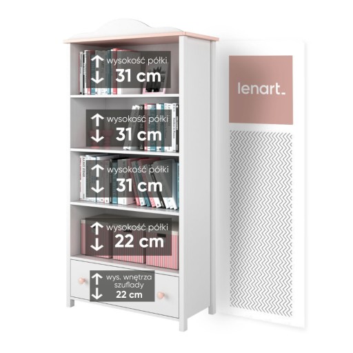 Kolekcja mebli LUNA doskonale sprawdzi się w pokoju małej księżniczki. Regał-biblioteczka na książki, pomoce naukowe i dekoracje, wyposażony w głębokie półki i łatwo dostępną dla dzieci, pojemną szufladę. Wygodna w użytkowaniu, ergonomiczna toaletka LUNA wyposażona w duże owalne lustro z przestronnym blatem roboczym, szafką z drzwiami, podręczną szufladą oraz sześcioma półeczkami na kosmetyki, dekoracje lub inne akcesoria. Idealna do pokoju każdej, mniejszej i większej, elegantki. Pojemna komoda LUNA z szufladą i dwojgiem drzwi pomieści pokaźną ilość garderoby i drobiazgów. Wygodne łóżko wraz z materacem bonellowy i szufladą na pościel, utrzymane w klastycznej stylistyce z wysokim zagłówkiem i zaokrąglonym wykończeniem. Stolik nocny z szufladą i drzwiami przyda się w każdej strefie wypoczynku i przechowasz w nim wszystkie niezbędne drobiazgi, posłuży też jako blat pod lampkę do czytania. Wielofunkcyjna skrzynia pomieści pościel lub zabawki, może też posłużyć jako stolik albo siedzisko. Dzięki podnośnikowi gazowemu łatwo ją otworzysz i zamkniesz. Półka LUNA wisząca na książki/dekoracje, która pozwala wykorzystać przestrzeń ścian do przechowywania. Mebel wykonano z wytrzymałej płyty laminowanej wykończonej trwałym obrzeżem ABS. Uchwyty z tworzywa. Każda księżniczka marzy o takich meblach do swojego pokoju.