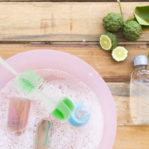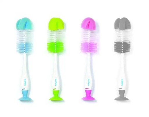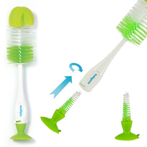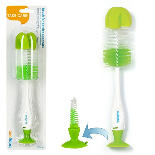 Szczotka z przyssawką „SAMOSTOJĄCA" pomaga w dokładnym czyszczeniu zarówno butelki, jak i smoczka. Szczotka posiada przyssawkę, która umożliwia przyczepienie jej do płaskich powierzchni, dla ułatwienia osychania. Szczotka do butelki jest zakończona miękką gąbką, która dostosowuje się do kształtu butelki. W uchwycie rączki jest schowana mała szczotka do czyszczenia smoczka. Miękkie włosie szczotek i gąbka docierają do trudno dostępnych miejsc. Szczotki wykonane są z trwałych i bezpiecznych materiałów, nie zawierających Bisfenolu A.