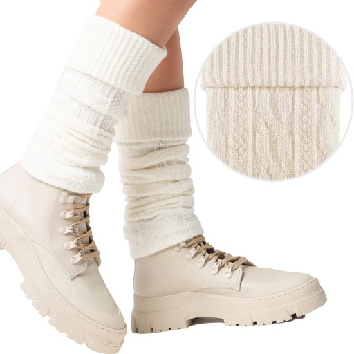 ⭐ PODKOLANÓWKI DAMSKIE getry wełniane OCIEPLACZE Warkocz ecru Steven