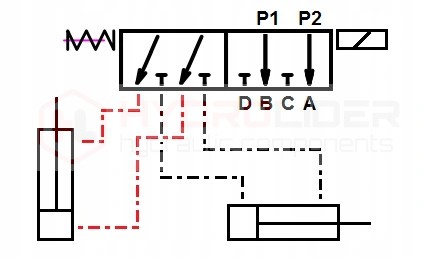 Suwak dwupozycyjny (1 - 2), na sprężynie, czyli sam wraca do pozycji neutralnej po odcięciu dopływu prądu. Podczas gdy suwak jest w pozycji neutralnej (1), możliwe jest sterowanie siłownikiem nr 1.