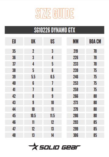 Solid Gear Dynamo to wyjątkowe połączenie buta przeznaczonego zarówno do biegów trailowych, jak i biegowych. Podeszwa środkowa wykonana w całości z ETPU zapewnia optymalny komfort i odbicie. Stabilność wynika z charakteru buta trailowego, ze specjalną konstrukcją płytki do kontroli zginania. Gumowa podeszwa zewnętrzna została opracowana z myślą o zapewnieniu doskonałej przyczepności i pomimo lekkości podeszwy przyczynia się również do stabilności. Cholewka ripstop o konstrukcji skarpety w połączeniu z BOA® Fit i technologią GORE-TEX® Stretch zapewnia wspaniałe czucie przy zachowaniu doskonałej oddychalności i utrzymuje stopę suchą. Dynamo GTX wykorzystuje specjalnie opracowaną wkładkę OrthoLite® o wysokim odbiciu, wykonaną głównie z materiałów pochodzących z recyklingu. Stabilizujący zapiętek wykonany został z zebranych odpadów oceanicznych, takich jak sieci na ryby. Antystatyczna, olejoodporna i antypoślizgowa to cechy gumowej podeszwy, które pozwalają na certyfikację Solid Gear Dynamo GTX zgodnie z normą EN-20347:2012.