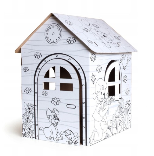 Domek z tektury z mocnego kartonu przeznaczony do samodzielnego montażu. Domek 2 w 1 Kolorowanka oraz świetna zabawa wewnątrz domku dla dzieci.