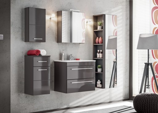 Twist Grey to kolekcja mebli łazienkowych, które wyróżnia prosta forma, efektowny głęboki kolor i pomysłowe rozwiązania. W kolekcji znajdziemy szafkę niską, wysoką oraz wiszącą, a także szafkę pod umywalkę o szerokości 60 cm, do której w ofercie znajduje się prostokątna ceramiczna umywalka. Dopełnieniem kolekcji jest szafka lustrzana, która spełnia wiele różnych funkcji, a przede wszystkim stanowi dodatkowe miejsce do przechowywania przyborów toaletowych. Większość szafek wyposażona jest w prowadnice kulkowe oraz podłużne uchwyty. Meble z kolekcji Twist Grey wpisują się w najnowsze trendy wnętrzarskie i przypadną do gustu wszystkim tym, którzy cenią dobry design.