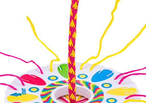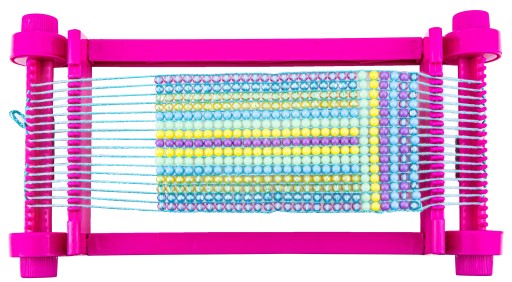Zestaw zawiera również krosno, dzięki któremu można stworzyć jeszcze inne, szersze i bardziej wzorzyste bransoletki. Przeplatając koraliki ułożyc można naprawdę ciekawe wzory.