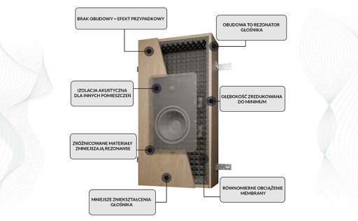 - Obudowa jest rezonatorem dla głośnika instalacyjnego | umożliwia równomierne obciążenie membrany, a tym samym mniejsze zniekształcenia głośnika i większą wydajność | wewnętrzne wytłumienie wysokiej jakości zapobiega efektom brzmienia pudełkowego przez głośniki | stworzona z wielu różnych materiałów, by zmniejszyć rezonanse