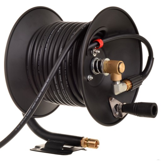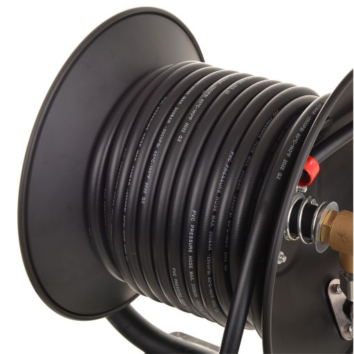 WążSTALOWY łączący bęben z myjką. Warstwa wewnętrzna to guma syntetyczna odporna naśrodki czyszczące i gorącą wodę oraz zewnętrzna odporna na ścieranie iwarunki atmosferyczne. Wąż posiada oplot stalowy co zwiększa jego żywotność oraz odporność na uszkodzenia mechaniczne oraz zapobiega załamaniom, odkształceniom, samozwijaniu.