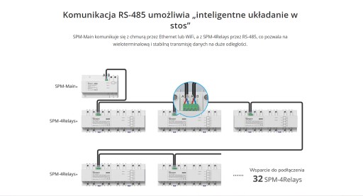 Jeden moduł SPM-Main pozwala kontrolować nawet 32 przełączniki SPM-4Relay. Co więcej, każdy SPM-4Relay oferuje aż 4 niezależne kanały o maksymalnym obciążeniu 20 A każdy. To oznacza, że SPM-Main może obsłużyć aż 128 kanałów! Dzięki temu idealnie sprawdzi się na przykład w bloku, umożliwiając sprawdzanie zużycia energii przez lokatorów wynajmowanych mieszkań.