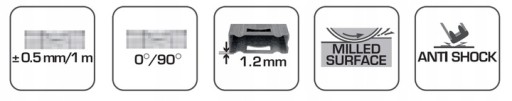 - frezowana krawędź boczna zwiększająca dokładność pomiarów, do +/- 0,5 mm/m