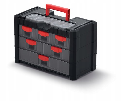 blokada przed wypadaniem szuflad, dodatkowy organizer szybkiego dostępu na obudowie, otwory do montażu naściennego, wygodny uchwyt do przenoszenia, szuflady różnego rozmiaru. Parametry techniczne: