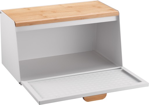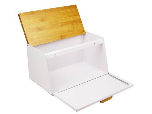 Pokrywy wykonane z metalu oraz drewna bambusowego posiadają możliwość dwustronnego otwierania, co świadczy o niezwykłej funkcjonalności chlebaka.