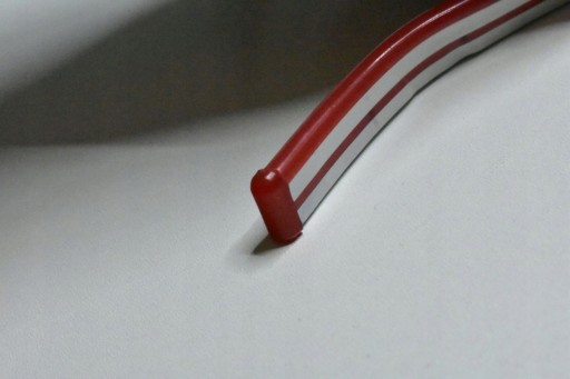 Neon flex LED zbudowany jest ze 120 led na 1 metr długości, dzięki czemu świecenie jest bardzo równomierne. Poza tym neon może być cięty co 2,5 cm w oznaczonych miejscach. Zewnętrzna powłoka neonu w kolorze biały z barwną jedną krawędzią. Doskonale się wygina i skręca - jest bardzo elastyczny.