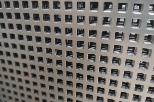 Blacha perforowana ocynkowana (ocynk ogniowy srebrny) z oczkami kwadratowymi w układzie prostym.