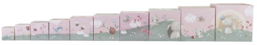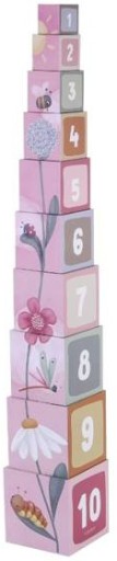 Wieża składa się z 10 elementów, które mieszczą się w największym pudełeczku, dzięki czemu, po skończonej zabawie nie zabiera dużo miejsca. Najmniejszy blok ma 5 cm, a największy 14 cm. Wszystkie elementy ozdobione są uroczymi ilustracjami z kolekcji Flowers & Butterflies. Wieża zapakowana jest w ładny karton z rączką ze sznureczka. Idealny pomysł na prezent