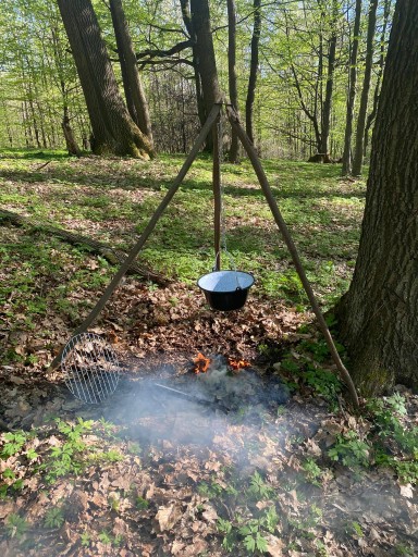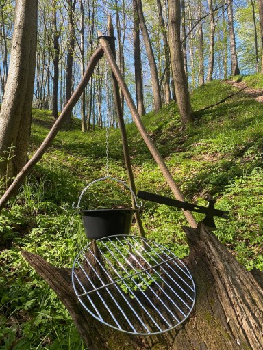 Przy użyciu tego gadżetu można zbudować trójnóg nad ognisko z dostępnych w lesie kijów, gałęzi.