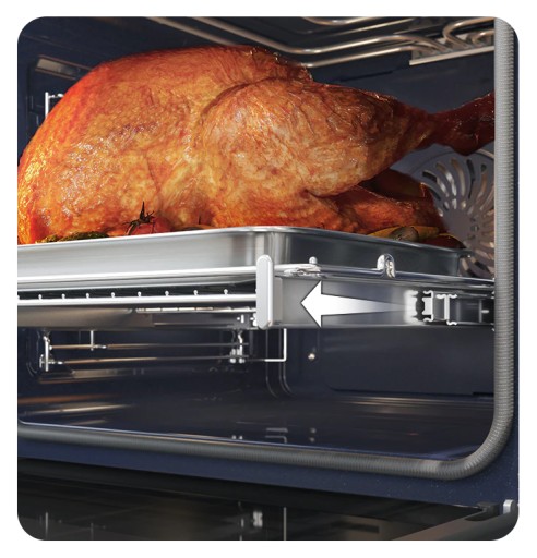 Łatwe wkładanie naczyń i wyjmowanie ich z piekarnika. Prowadnice teleskopowe wysuwają się płynnie i są stabilne nawet wtedy, gdy stawiane są na nich duże i ciężkie naczynia. Dzięki tej funkcji można także podlewać, obracać i doprawiać potrawy bez ryzyka rozlewania.