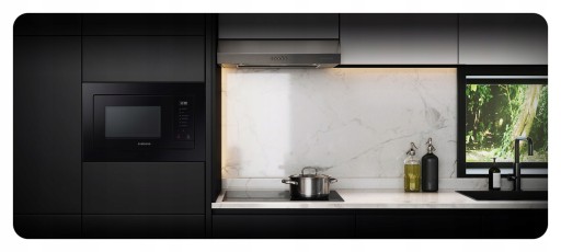 Kuchenka mikrofalowa została wykończona w eleganckim czarnym szkle z nowoczesnym, białym wyświetlaczem LED, co wygląda niezwykle szykownie. Również jej dotykowy panel sterowania otrzymał minimalistyczny design, ułatwiający obsługę urządzenia.
