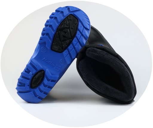 - antypoślizgowa elastyczna podeszwa z głęboko wyżłobionym protektorem z termo kauczuku (TR) idealnie izoluje od zimna – nie zmienia swoich właściwości nawet w bardzo niskich temperaturach