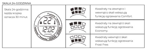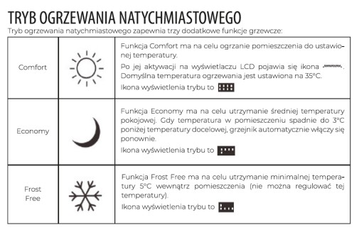 ️✅wbudowany termostat – utrzymuje zadaną temperaturę z dokładnością co do stopnia oraz uniemożliwia spadek temperatury w pomieszczeniu poniżej 5°C (funkcja ochrony przed zamarzaniem).