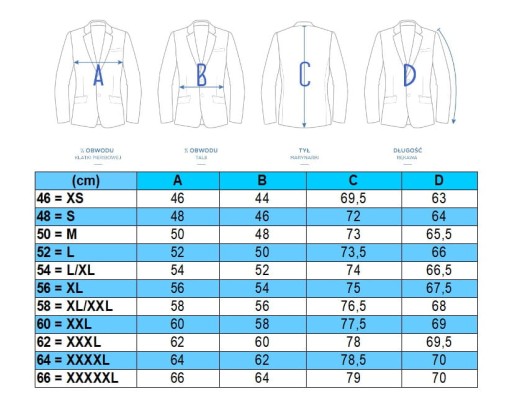 - Przy wyborze rozmiaru proponujemy zmierzyć swoje dotychczas noszone ubrania, te które leżą na Tobie najlepiej (marynarka lub kurtka) - porównaj z tabelą.