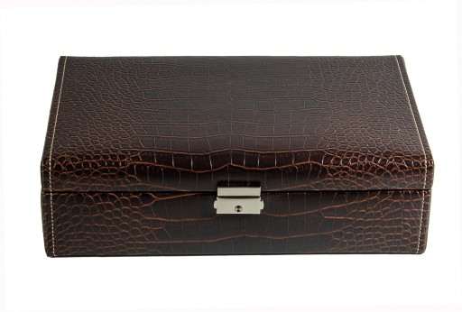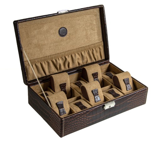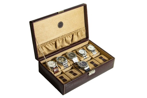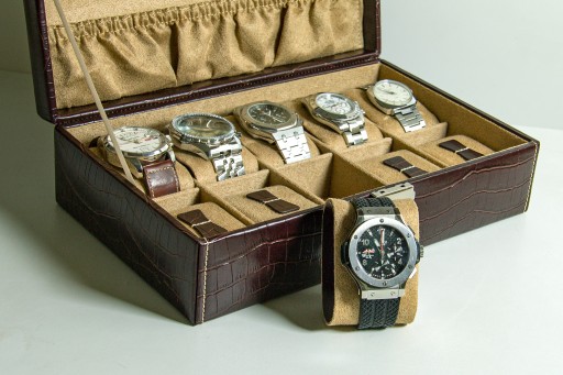 Piękne pudełko na 10 zegarków Friedrich seria LeCroc z dodatkową kieszonka na akcesoria i inne dodatki. Perfekcyjna jakość wykonania. Świetnie wyglądająca skóra syntetyczna. Duże ściśliwie osadzone poduszki na zegarki. Idealne dla dużych zegarków do fi 6 cm. Z tylu otwór na kabel do zasilania smatwatchy.