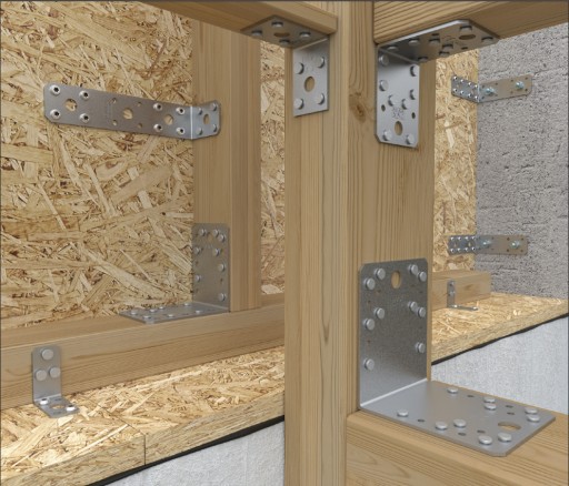 Do montażu kątowników można stosować łączniki trzpieniowe takie jak wkręty do drewna, gwoździe pierścieniowe ANCHOR, kotwy do betonu oraz śruby.