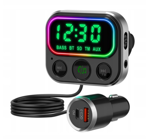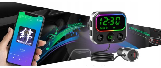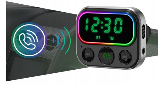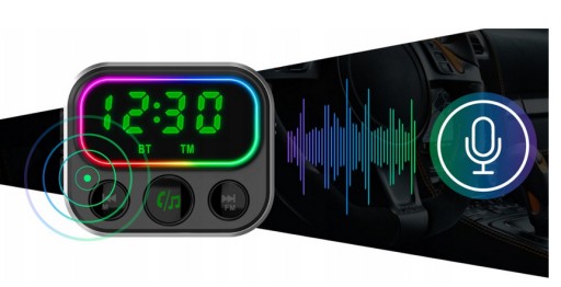Transmiter FM z funkcja głośnomówiącą, umożliwiający odtwarzanie plików audio z nośników zewnętrznych za pośrednictwem wyjścia AUX, Bluetooth lub kart pamięci micro SD.