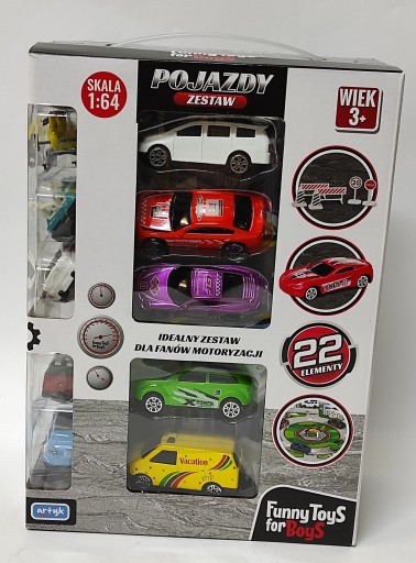 Zestaw pojazdów 22 elementy. W zestawie: 15 modeli pojazdów 6,5 cm,mata 77 x 53 cm,znaki drogowe. Materiał: metal + plastk.Funkcje: napęd frykcja.