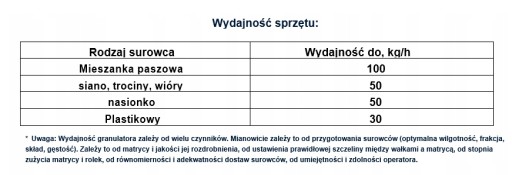 - Możliwość zainstalowania dysz o różnych średnicach pozwala na produkcję paszy dla wszystkich rodzajów zwierząt (ptactwo - kury, kurczaki, przepiórki, bażanty; króliki; bydło; konie, ryby);
