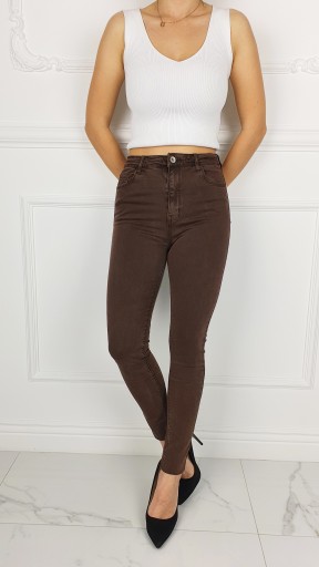 Świetne klasyczne spodnie w kolorze brązowym, posiadają wysoki stan. Świetne do sportowego obuwia ale idealnie też sprawdzą się w połączeniu ze szpilkami, dzięki swojej uniwersalności, pasują niemal do każdej stylizacji. Elastyczny materiał podkreśla kobiecą sylwetkę. Spodnie są dopasowane, rozciągają się. Podkreśl swoje kobiece kształty! Spraw, by Twój codzienny Look był niepowtarzalny. Spodnie po obu stronach posiadają kieszenie.
