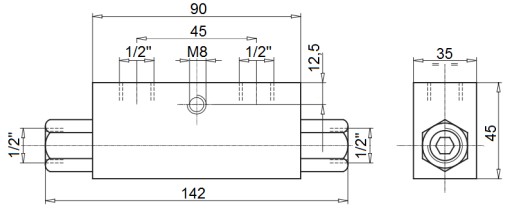 Maksymalny przepływ: 50 l/min Ilość otworów hydraulicznych w korpusie: 4 Gwinty wewnętrzne w korpusie: 1/2'' [BSP] Materiał korpusu: stal galwanizowana Dopuszczalne maksymalne ciśnienie: 350 bar Ciśnienie otwarcia blokady przepływu: 6 bar Waga: 1,042 kg