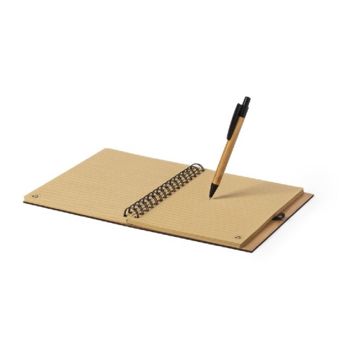 Notatnik bambusowy A5 (80 kartek w linie), twarda okładka, bambusowy długopis w komplecie, spiralne bindowanie.