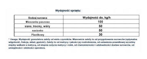 Wydajność granulatora zależy od mocy silnika. Im wyższa moc, tym większą średnicę można zamontować matrycy roboczej, a tym samym jej wydajność będzie wyższa.