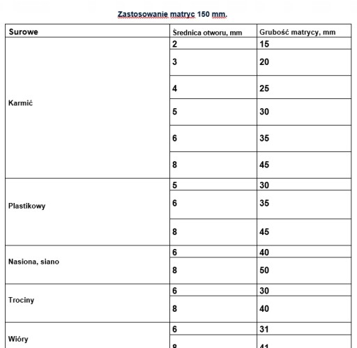 Średnica peletu zależy od tego, jakie otwory będą w matrycy. Przy zamówieniu można wybrać jedną matrycę z otworami od 2 do 8 mm, która zostanie od razu zamontowana w peleciarce. !!! Określenie w uwagach do zamówienia (prosimy również o wskazanie surowca, który planują Państwo wykorzystać)