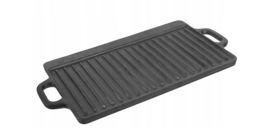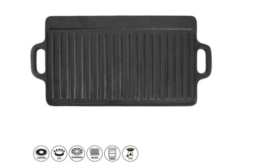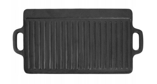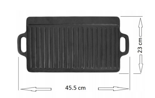 - ŻELIWNA - Płyta żeliwna płyta do grillowania mięs, ryb i warzyw. Patelnia ma wymiary 45,5 x 23 x 1,5 cm. Naczynia wykonane z żeliwa idealnie rozprowadzają ciepło oraz długo utrzymują wysoką temperaturę.