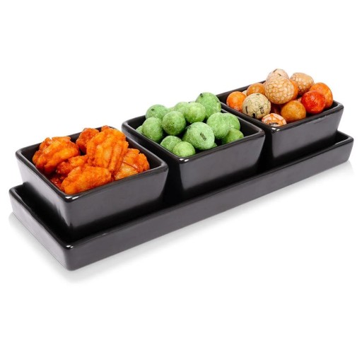 Zestaw trzech miseczek na tacy. Solidnie wykonane w modnym, czarnym kolorze, idealnie pasuje do każdej zastawy. Zestaw pięknie prezentuje się na stole. Serwowane sosy lub przekąski są umieszczone w jednym miejscu. Pasuje do każdego wnętrza. Sprawdzi się do użytku domowego oraz profesjonalnego. Wyprodukowano zgodnie z europejskimi standardami.